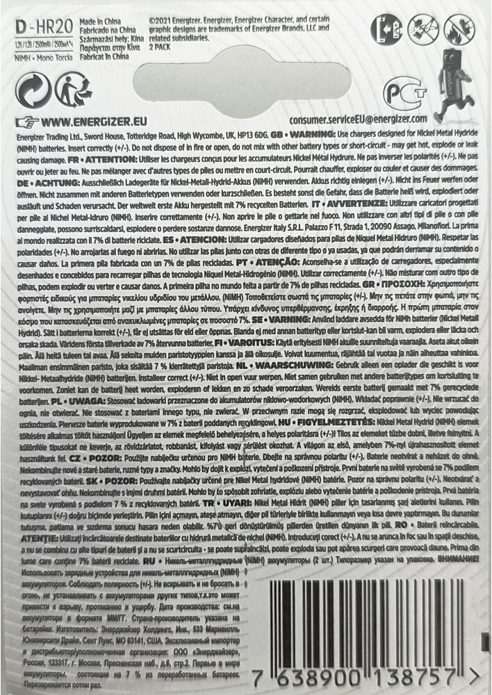 Аккумуляторные батареи Energizer Recharge Power Plus D 2500 mAh являются одними из самых высококачественных среди перезаряжаемых Ni Mh батарей.