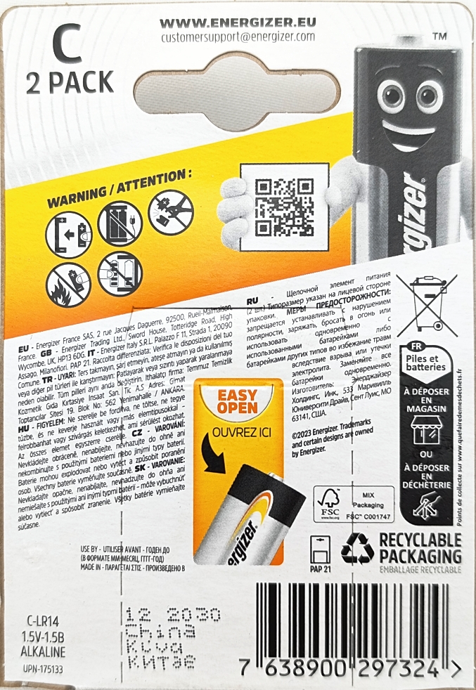 Серия Alkaline Power упакована в прочный, вместительный блистер, содержащий 2 элемента питания типа C.